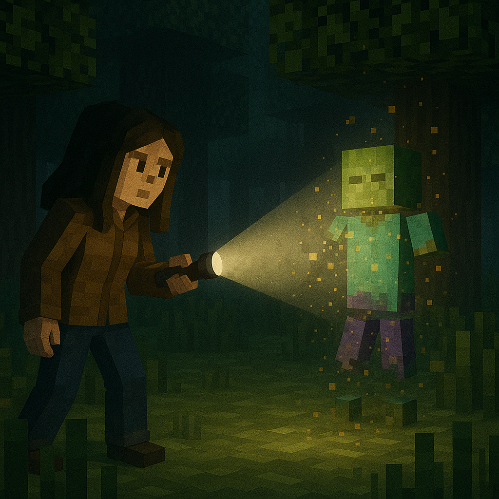 Eine Frau steht in der Dunkelheit, nur ihre Taschenlampe durchschneidet das Schwarz. Als der Lichtstrahl einen der Schatten trifft, beginnt die Kreatur sich aufzulösen, als würde das Licht selbst die Wahrheit freilegen.