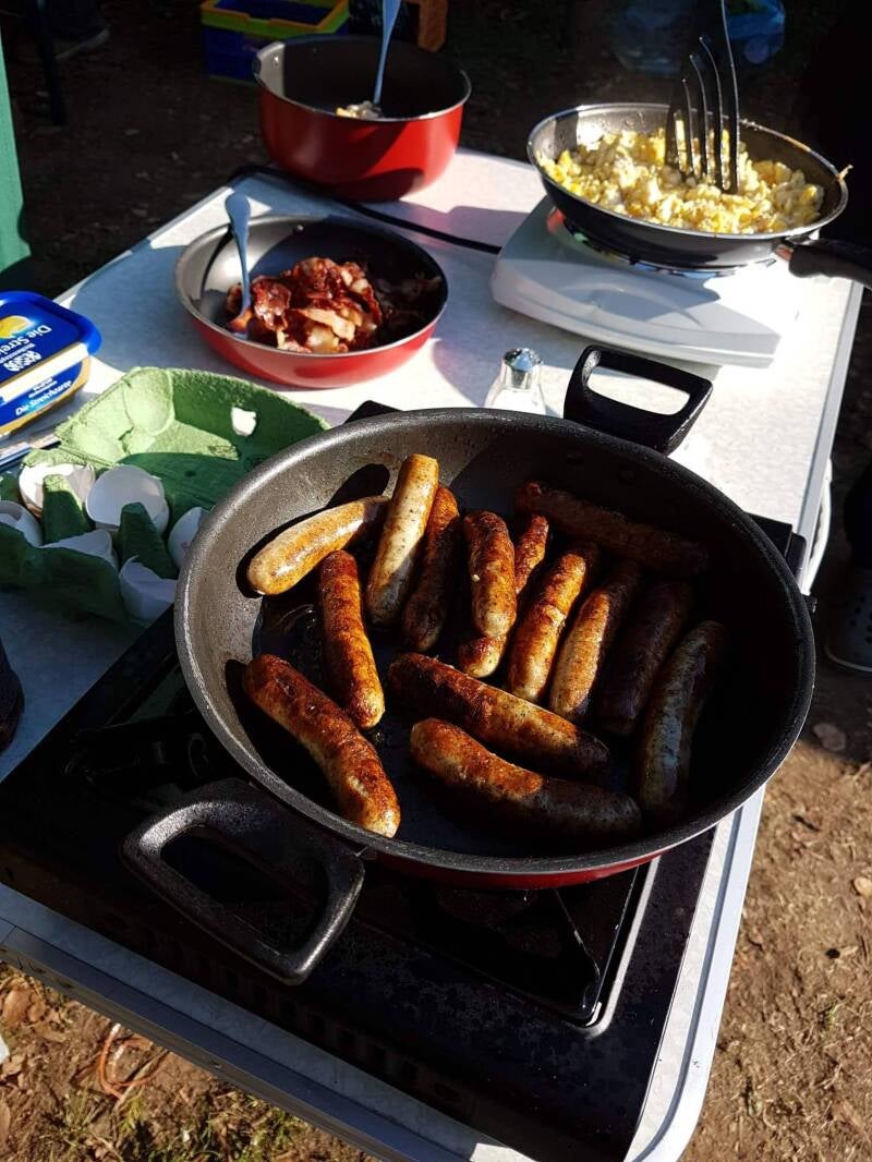 Wir waren so übelst geil ausgestattet, das wir draußen vor unserem Festzel…. Äh unserer Überdachungsmöglichkeit Würstchen, Eier und Speck braten konnten. Ich klatschte mir alles auf ein Brötchen. Geil ohne mist, probiert das aus: Brötchen auf - Rührei, Bratwürste, Speck rein - Brötchen zu - Essen und genießen.